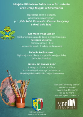 Z tej okazji Miejska Biblioteka Publiczna w Strumieniu oraz Urząd Miejski w Strumieniu zapraszają najmłodszych do udziału w konkursie plastycznym „Żabi Świat Strumienia – Konkurs Plastyczny z okazji Dnia Żaby” Bo przecież Gmina Strumień ma swoją wyjątkową żabkę – Gratkę! Pokażcie, jak wygląda żabi świat widziany oczami dzieci — technika dowolna, liczy się kreatywność i dobra zabawa
