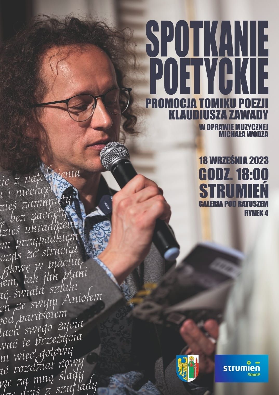 Polecamy Państwu spotkanie poetyckie Klaudiusza Zawady zaplanowane na najbliższy poniedziałek 18 września w strumieńskiej Galerii Pod Ratuszem.