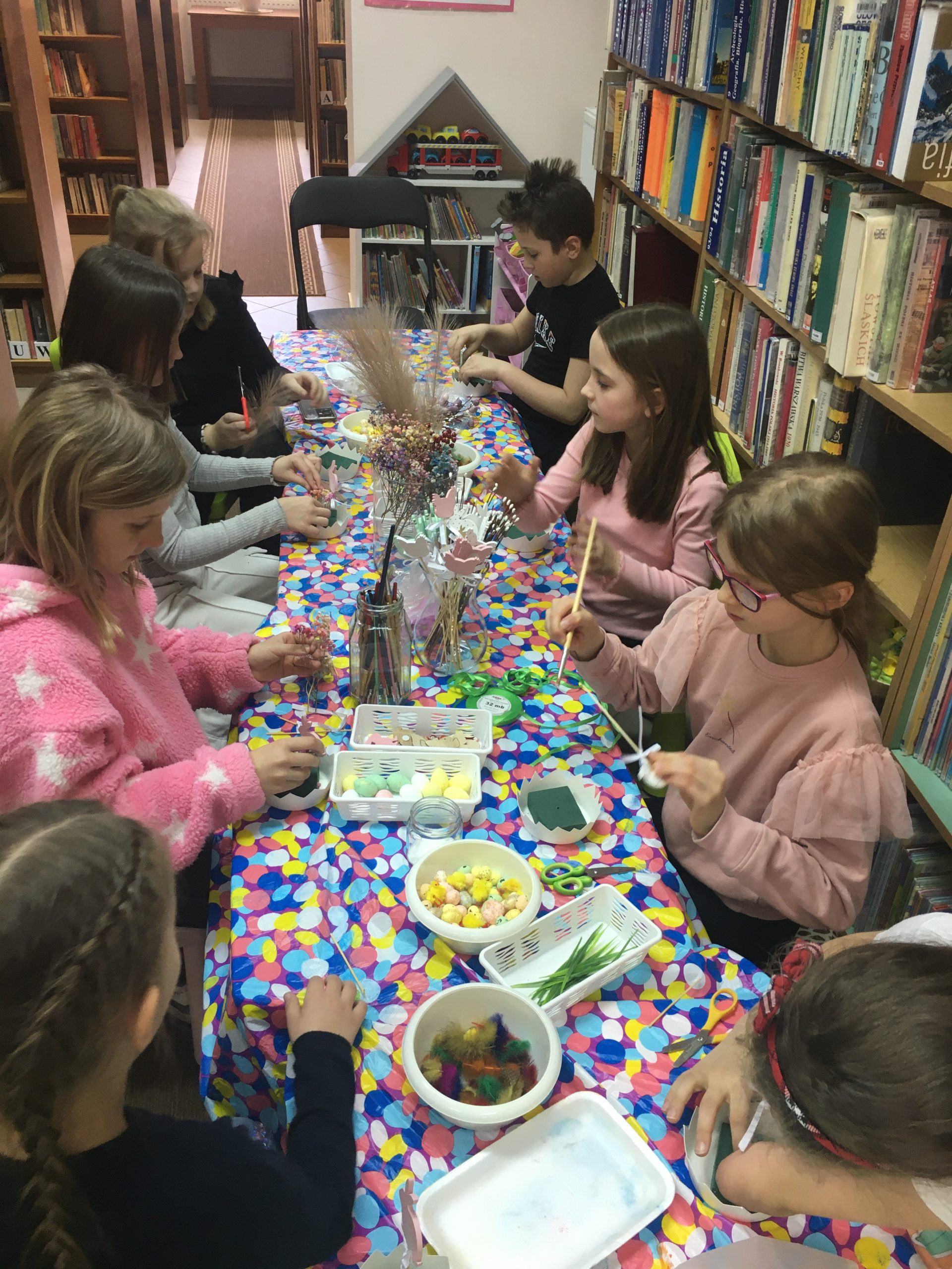 Tuż przed tegorocznymi Świętami Wielkanocnymi dzieci stworzyły w bibliotece piękne świąteczno-wiosenne stroiki, które podarują swoim bliskim ![]()